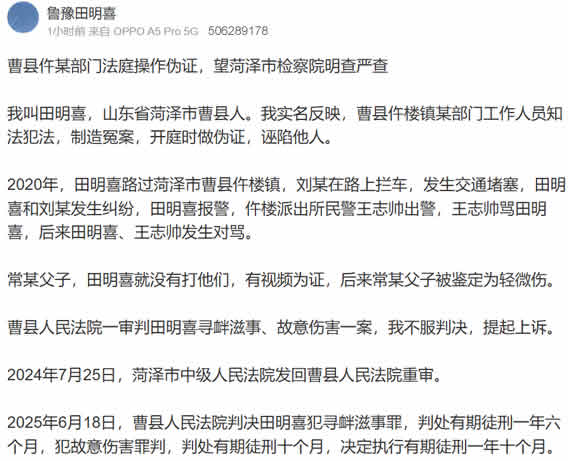 我叫田明喜,山东省菏泽市曹县人。我实名反映,曹县仵楼镇某部门工作人员知法犯法,制造冤案,开庭时做伪证,诬陷他人。