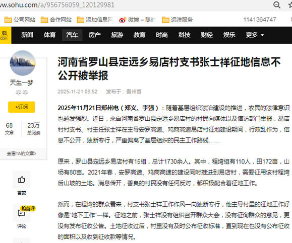 2025年11月21日郑州电(郑义、李强):随着基层组织法治建设的推进,农民的法律意识也越发强烈。近日,来自河南省罗山县定远乡易店村的村民向媒体以及信访部门举报,易店村村支书、村主任张某在主导安罗高速、鸡商高速易店村征地建设期间,行政乱作为,信息不公开,独断专行,严重偏离了基层组织的民主工作路线……