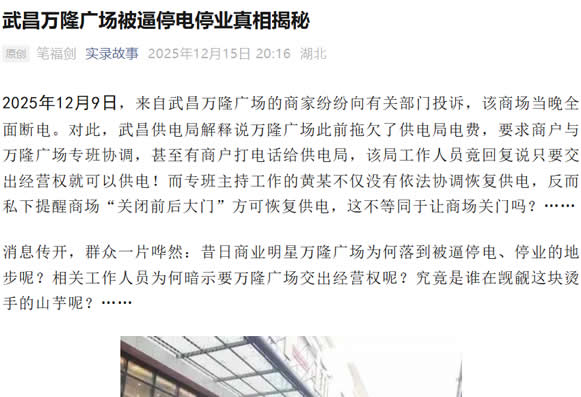 消息传开,群众一片哗然:昔日商业明星万隆广场为何落到被逼停电、停业的地步呢?相关工作人员为何暗示要万隆广场交出经营权呢?究竟是谁在觊觎这块烫手的山芋呢?……