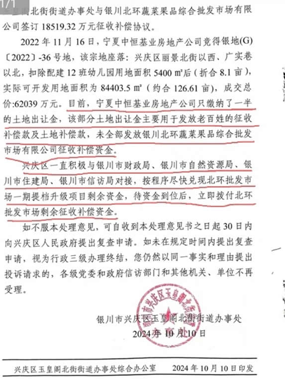 在2024年10月10日玉皇阁北街街道办出具的《信访事项处理意见书》中,指尖新闻记者看到,除了证实宁夏中恒基业房地产公司未付清土地出让金,北环市场没有足额拿到征收补偿资金外,针对拆迁款拖欠问题,兴庆区政府一直积极与银川市财政局、自然资源局、住建局、信访局等部门对接,并承诺将按程序尽快兑现该项目剩余资金,待资金到位后立即拨付北环市场剩余征收补偿款。