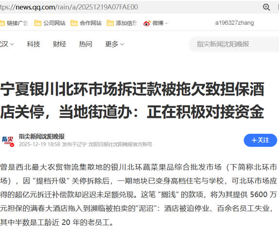 曾是西北最大农贸物流集散地的银川北环蔬菜果品综合批发市场(下简称北环市场),因 “提档升级” 关停拆除后,一期地块已变身高档住宅与学校,可北环市场应得的超亿元拆迁补偿款却迟迟未足额兑现。这笔 “搁浅” 的款项,将为其提供 5600 万元担保的满春大酒店拖入到濒临被拍卖的“泥沼”:酒店被迫停业、百余名员工失业,其中半数是工龄近 20 年的老员工。